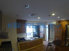 Mediterranean styled kitchen has been fully renovated with teak wood and granite countertop. The kitchen has been outfitted with a new cooking range and a steel fridge.