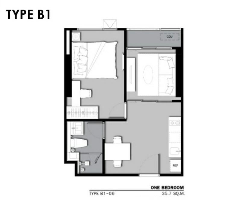 เนื้อที่ 35.7 ตารางเมตร 1 ห้องนอน 1ห้องน้ำ เป็นห้อง Type B1 อาคาร B ตำแหน่ง B113