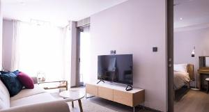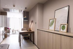 ขายคอนโด Noble Revent 1 ห้องนอน 1 ห้องน้ำ 47.5 ตร.ม. ห้องบิ้วอินเคาน์เตอร์ครัว และตู้ชั้นวางในโซนนั่งเล่น