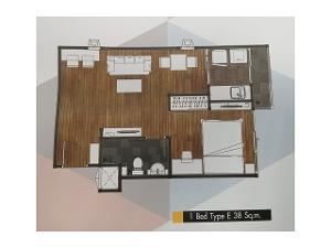 แบบห้อง 1-Bedroom E1 ชั้น 7 เลขที่ห้อง 1B719 ขนาด 38 ตร.ม. อาคาร B ใกล้ทางเข้าออก