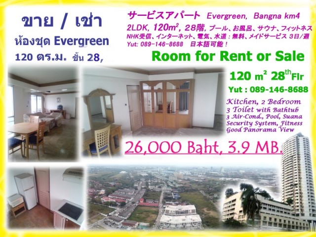 賃料 :26,000 バーツ/月、 Yut 089-146-8688 日本語可能!!!